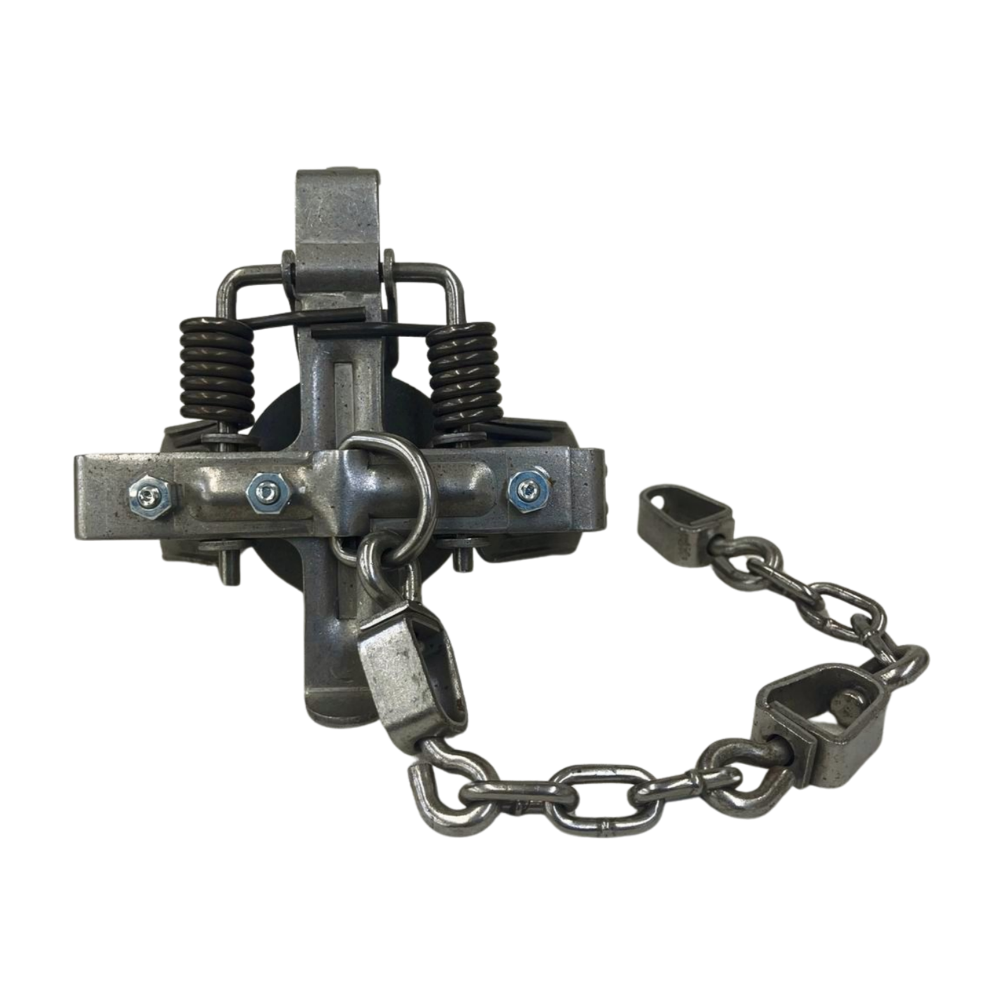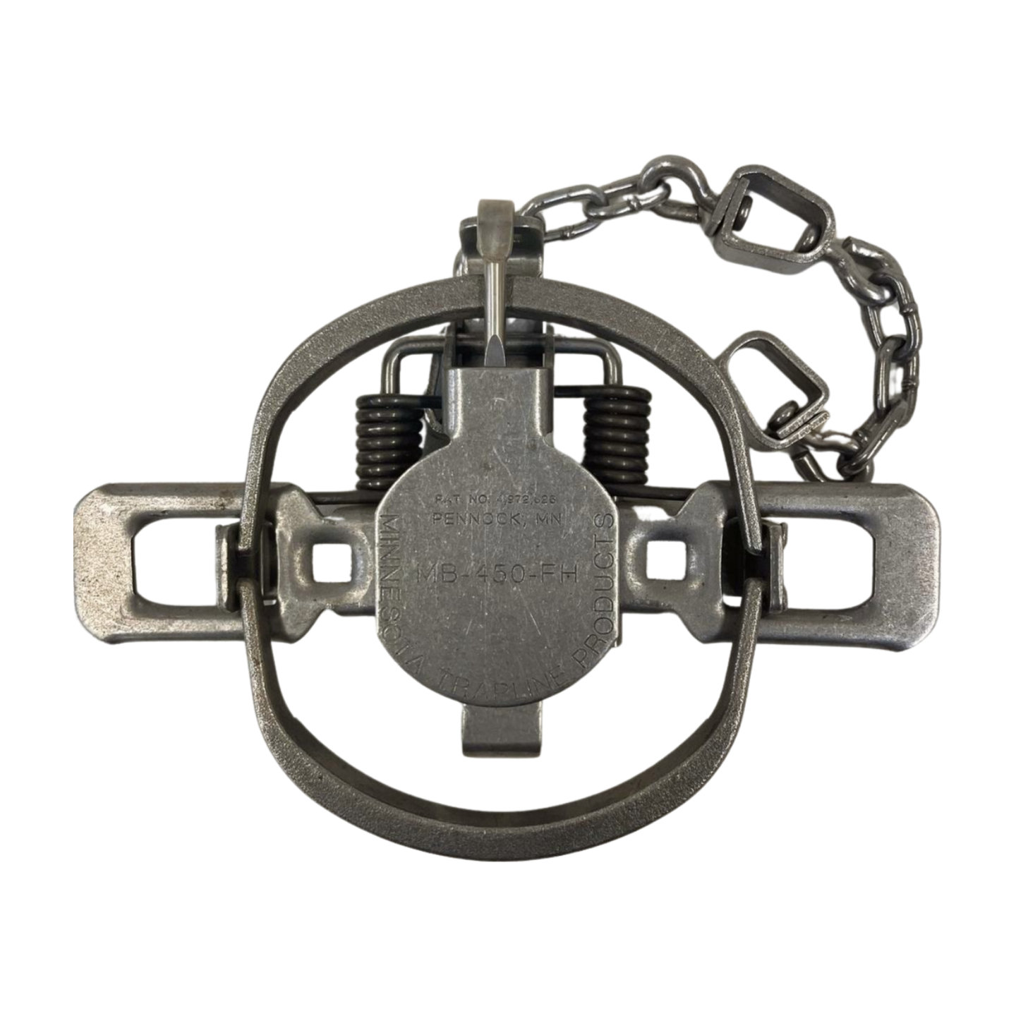 The MB-450-FOX is a #1.5 size trap but built to hold the meanest, nastiest coyote. Outside jaw spread is 5" and inside jaw spread 4 3/8". The 450 has 5/16 thick, smooth closed cast jaws. Features include a Paws-I-Trip Pan with night latched dog heavy levers, strong music wire springs, #2 chain, crunch proof swivels, and a 2-piece gusseted frame for strength and reliability.