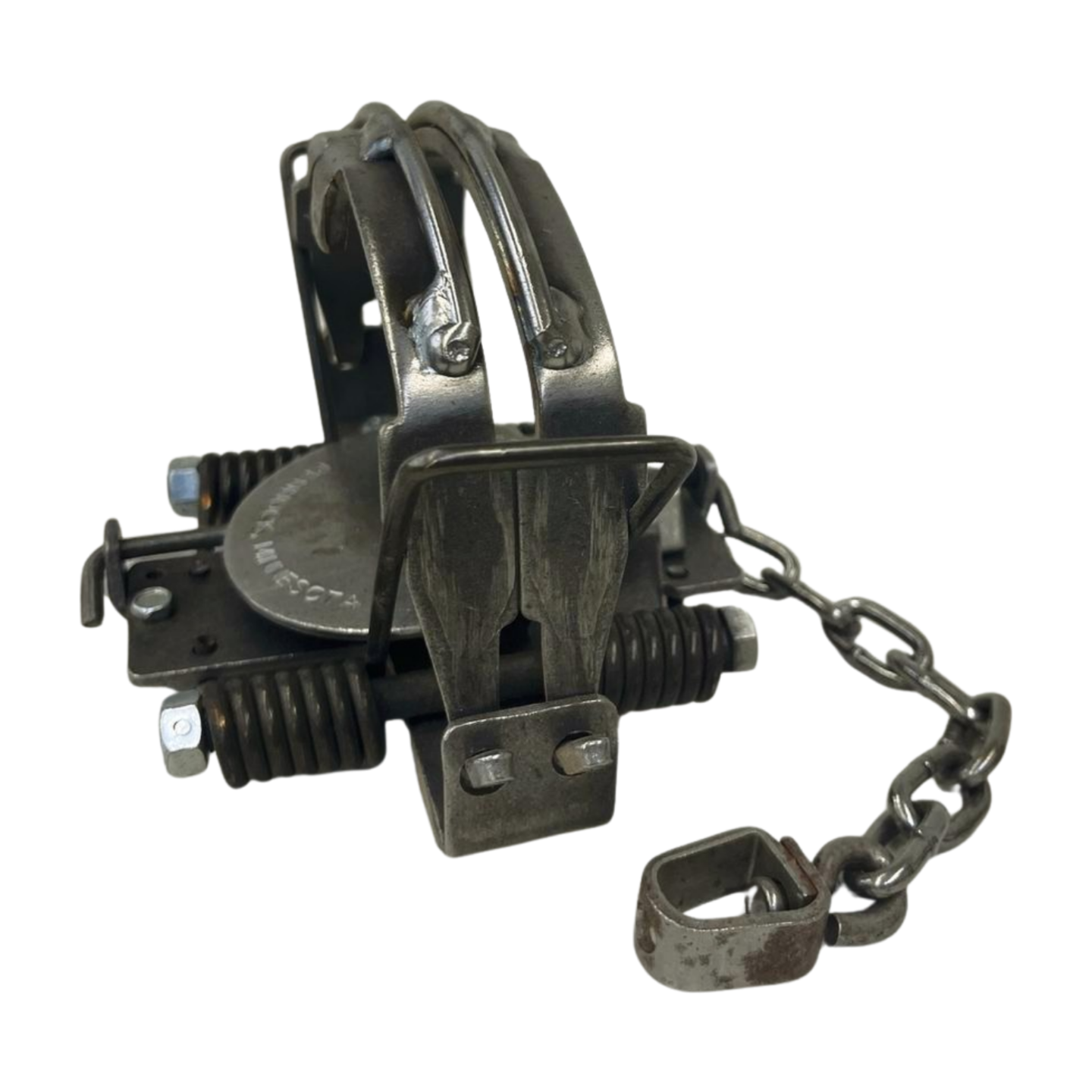 The MB-650 OL is heavy-duty from top to bottom and comes with 1/4" offset jaws and a 6 1/8" inside jaw spread and 6 7/8” outside jaw spread. 3/16” roll rod is used to laminate the jaw on the outside giving you a deeper jaw face. This custom-made trap is 4-coiled, baseplated, center swiveled and has an extra heavy-duty oversize pan which provides for a huge kill area. The pan tension is adjustable with a #10 pan bolt. Both heavy jaws are held down by a special trigger system that will keep any animal from flipping up a loose jaw. The dog has a "step-down" notch milled into it that gives you an audible click when you are lowering the pan. We've of course installed our MB Crunch Proof Swivels and heavy duty #3 select chain. Available in six jaw configurations to fit your needs. The MB-650 has a unique spring and lever system which is all one piece. All MB-650’s have an offset jaw and are 4-coiled.