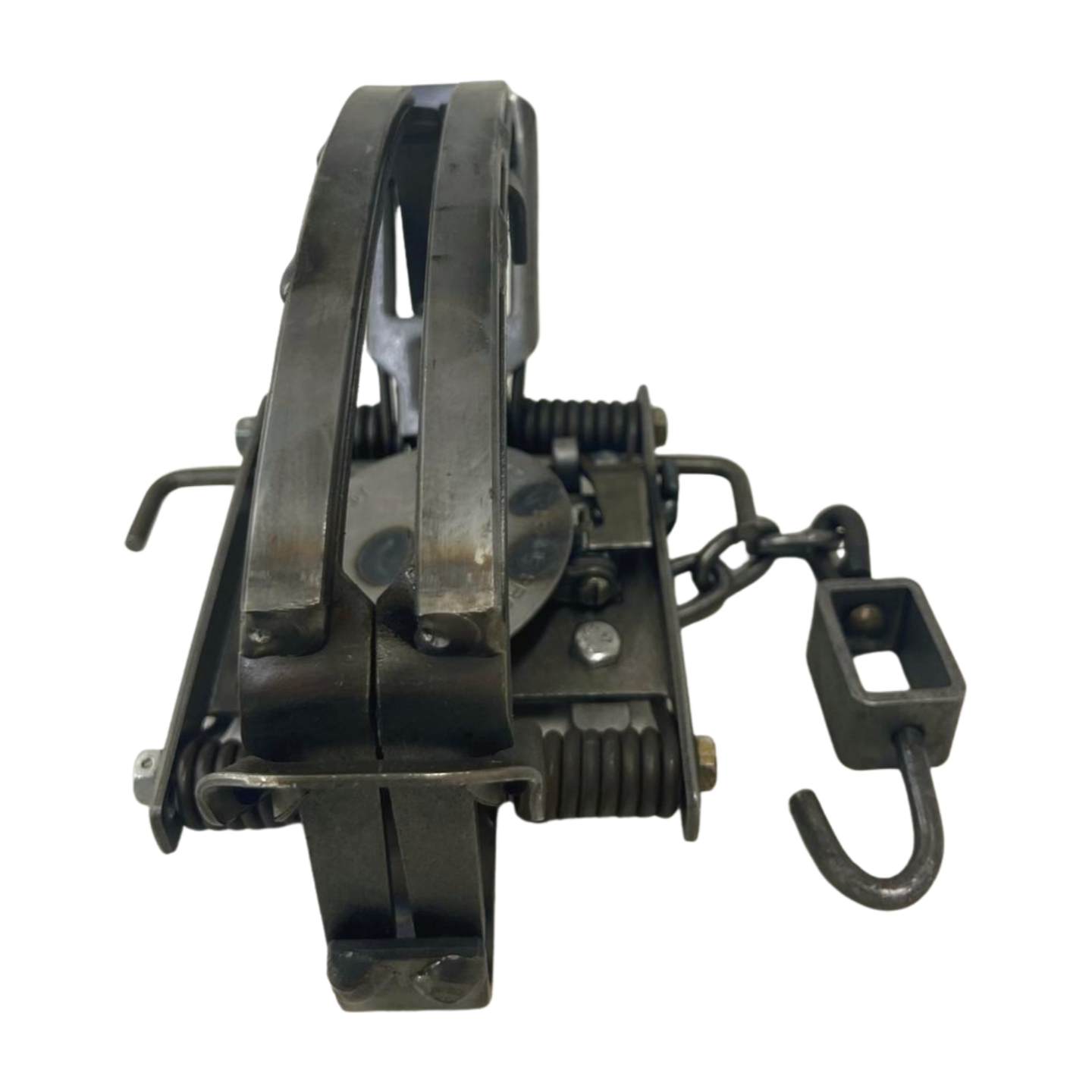 Laminated offset jaws. X-HD springs. Finally a coilspring trap that will stand up to abuse by either wolf or cougar that you can actually afford to buy. The MB-750 "Wolf" has the same heavy frame and jaws as the MB-750 "Beaver" plus extra heavy music wire springs and a super heavy-duty wolf swivel with welded rivets coming off the D-ring baseplate. Offset jaws (your choice of 1/4" or 3/8") with 3/16" thick X 1/2" wide flat lamination strips are standard equipment. Laminated 1/4" or 3/8" offset jaws. (As most "Wolfers" prefer to develop their own chain set-ups, the MB-750 "Wolf" comes with 5 links of MB #5 XHD chain and a wolf swivel.)